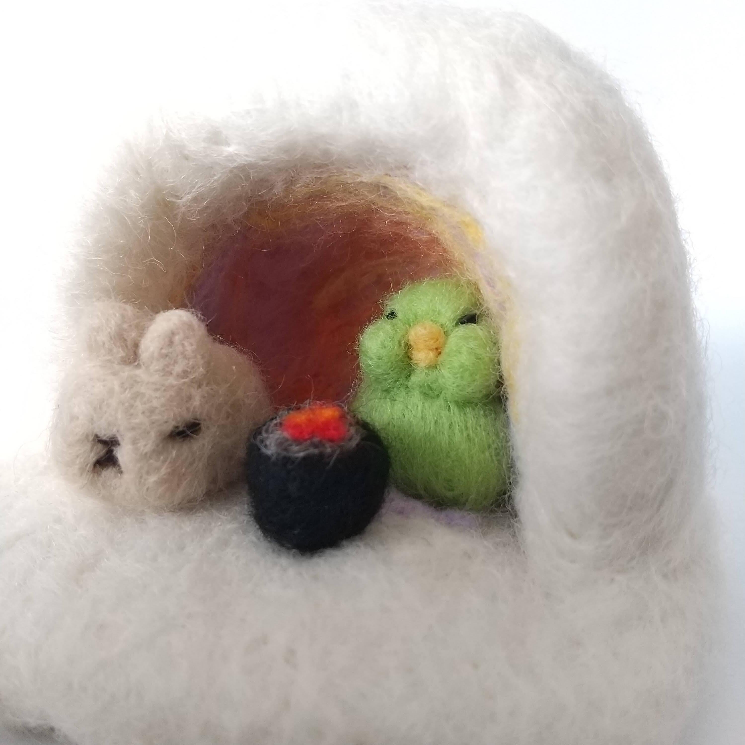 取扱いについて:羊毛作品は観賞用です。ひとつひとつ丁寧に作ってはおりますが、羊毛の特性上強くひっぱったり擦ったりすることで、形が崩れたり毛が乱れる可能性がありますので、お取り扱いにはご注意願います(少しの毛羽立ちであれば、市販のニードルで毛を埋め込むか、ハサミで毛を整えることで直ります)。
