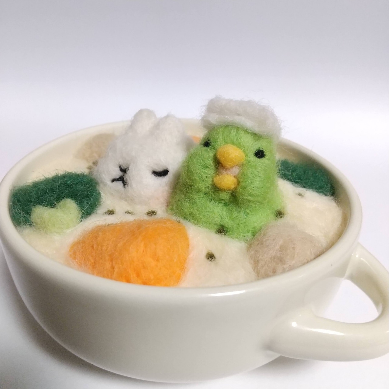 取扱いについて:羊毛作品は観賞用です。ひとつひとつ丁寧に作ってはおりますが、羊毛の特性上強くひっぱったり擦ったりすることで、形が崩れたり毛が乱れる可能性がありますので、お取り扱いにはご注意願います(少しの毛羽立ちであれば、市販のニードルで毛を埋め込むか、ハサミで毛を整えることで直ります)。